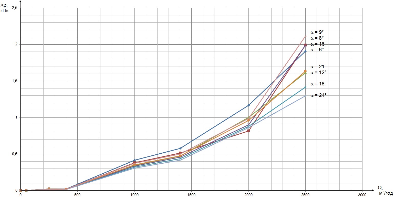 Рис. 5 - Залежність втрати тиску ∆р від витрати Q при різних кутах розходження дифузорної ділянки