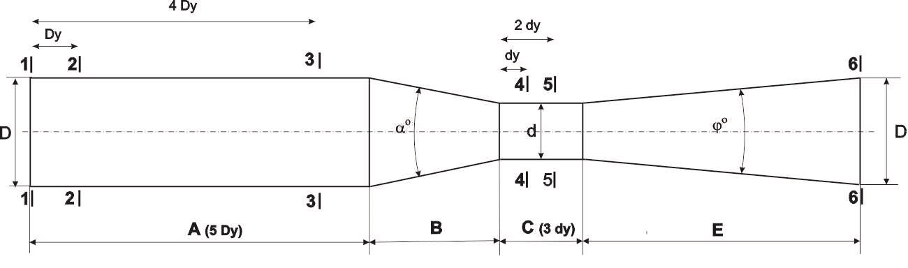При проведенні досліджень однією з основних задач було створення максимально симетричної гідродинамічної картини течії на вході засобів вимірювання, особливо ультразвукового класу, та визначення впливу конфігурації вузла обліку на втрату тиску в потоці і окреслення параметрів геометричної форми, які забезпечують максимальне відновлення падіння тиску на комплексі. Для цього із застосуванням комплексу обчислювальної гідродинаміки реалізованого в програмному пакеті Ansys Workbench CFX, проведено дослідження впливу геометричних характеристик пристроїв звуження та розширення потоку подібних трубі Вентурі (рис.3.).