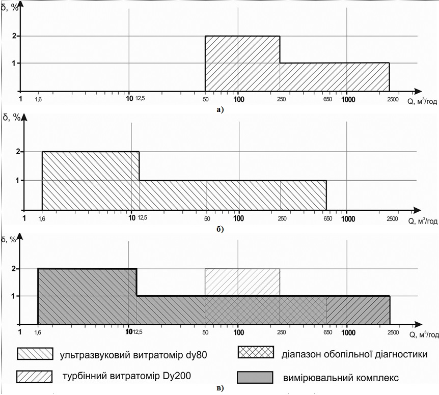За технічними характеристиками, що окреслюють точність вимірювання турбінних та ультразвукових лічильників газу, побудовані діаграми залежності похибки вимірювання від величини витрати (рис.2).