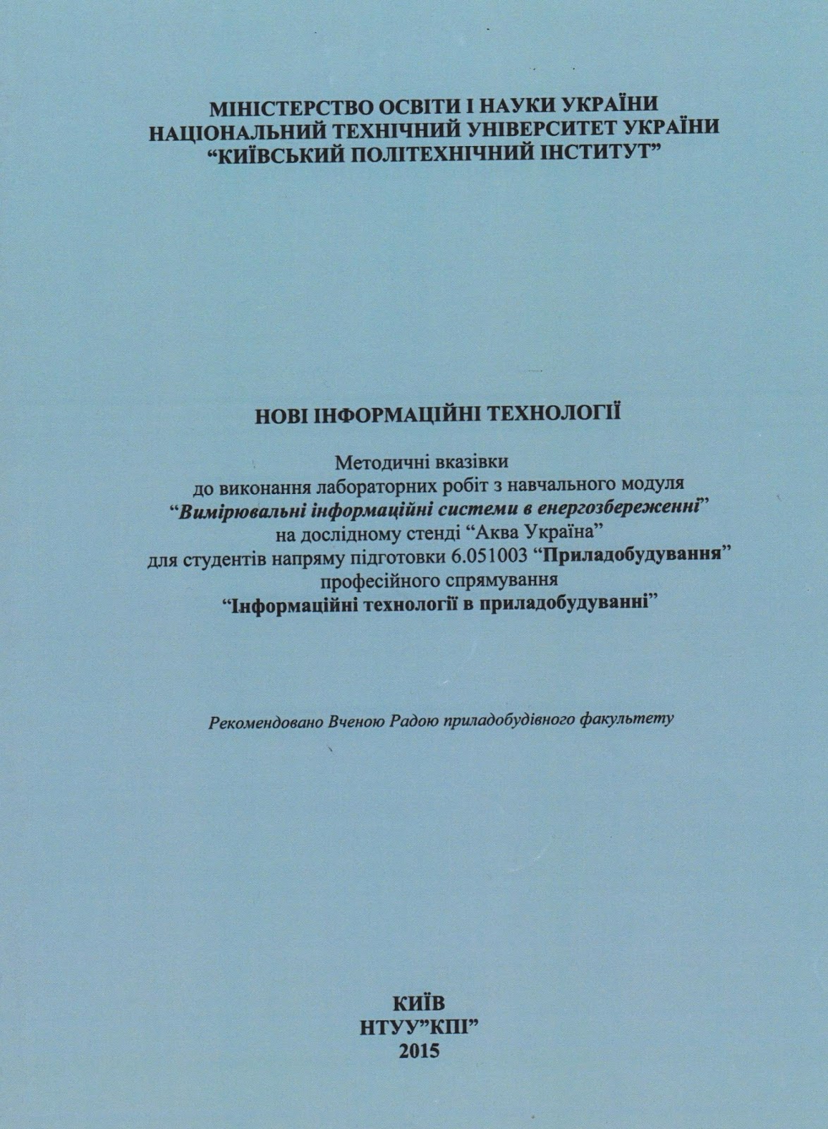 Співробітниками НДЦ "ПРІСЕ" було розроблено Методичні вказівки до виконання лабораторних робіт на експериментально-навчальній проливній установкці “Аква Україна” для студентів професійного спрямування “Інформаційні технології в приладобудуванні”, навчальний модуль “Вимірювальні інформаційні системи в енергозбереженні”.